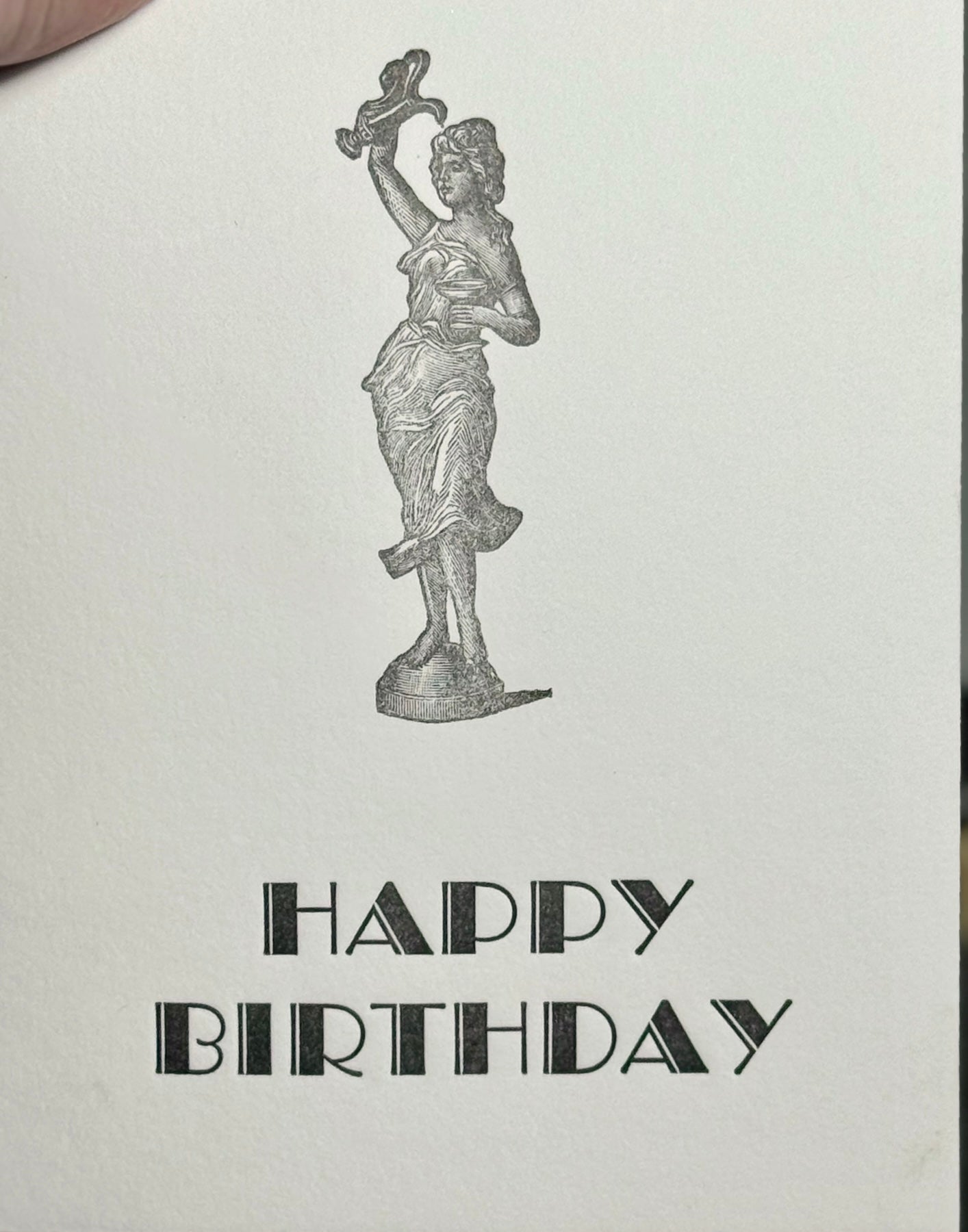 Printed on a 120 year-old platen press (FM Weiler Boston Tiegel), using vintage lead type and a vintage cut. Each card is handprinted by Charles and is unique.